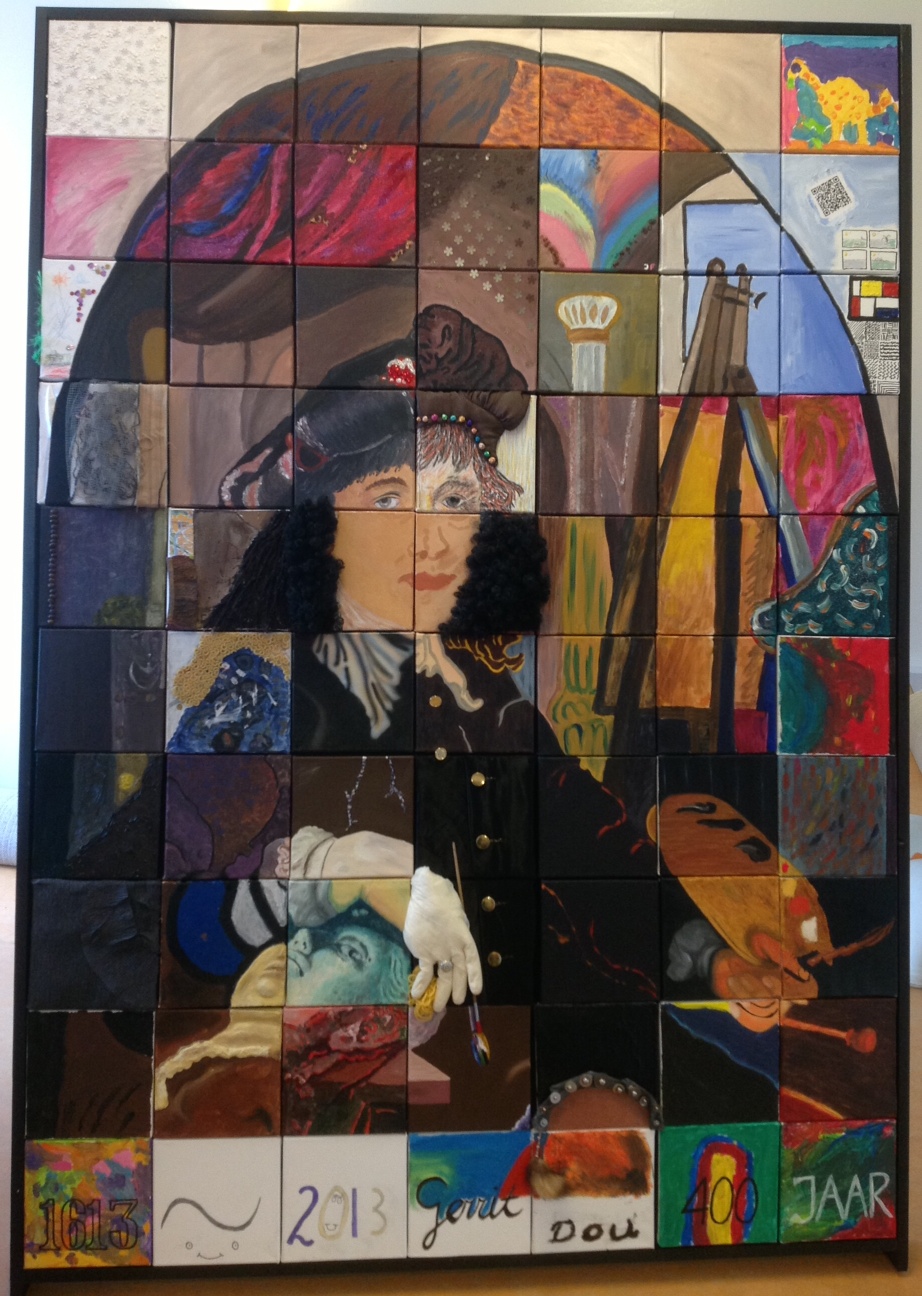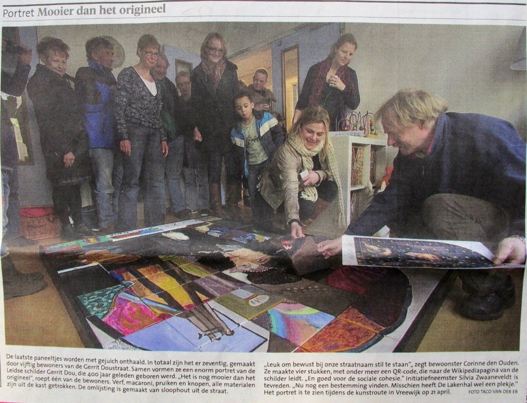 Silvia Zwaaneveldt, bewoonster Gerrit Doustraat, heeft haar straatgenoten geënthousiasmeerd met een pracht-idee: een zelfportret van Gerrit Dou gezamenlijk opnieuw maken. Hiertoe werd een zelfportret geprojecteerd over 70 paneeltjes van 20 x 20 cm en werden de contouren van het zelfportret overgebracht op de paneeltjes door Silvia en Saskia Masselink. Ruim 50 bewoners van de Gerrit Doustraat hebben zich vervolgens ingetekend op één of meerdere paneeltjes, om vervolgens op creatieve wijze deze contouren verder in te vullen en vorm te geven. Er is geschilderd met acrylverf, olieverf, er is geairbrusht. Er werd met stoffen gewerkt, geborduurd. Er is gebruik gemaakt van macaroni, koffiebonen en klei. Delen van een pruik, een handschoen met een heuse ring en zelfs een QR-code is aangebracht op de paneeltjes. Het geheel is tijdens een feestelijke bijeenkomst voor straatbewoners bij elkaar gevoegd in een grote lijst die kunstig werd gemaakt door Mathijs Hobijn en Hilde van der Linde.