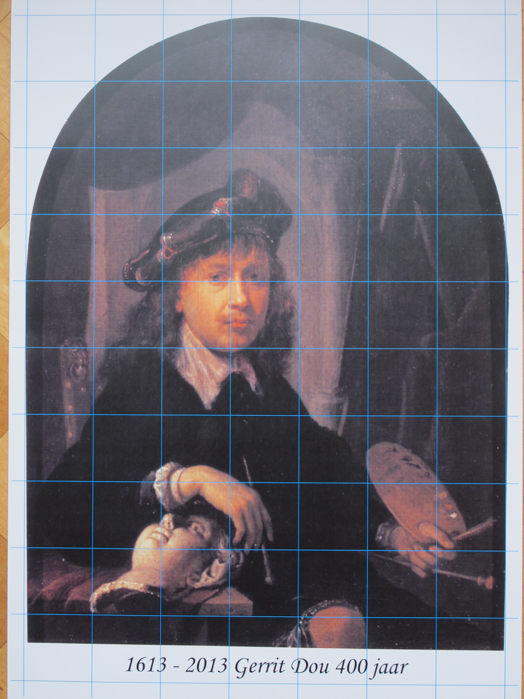 Het originele zelfportret van Gerrit Dou uit 1635, voorzien van het raster voor het buren-schilderij
