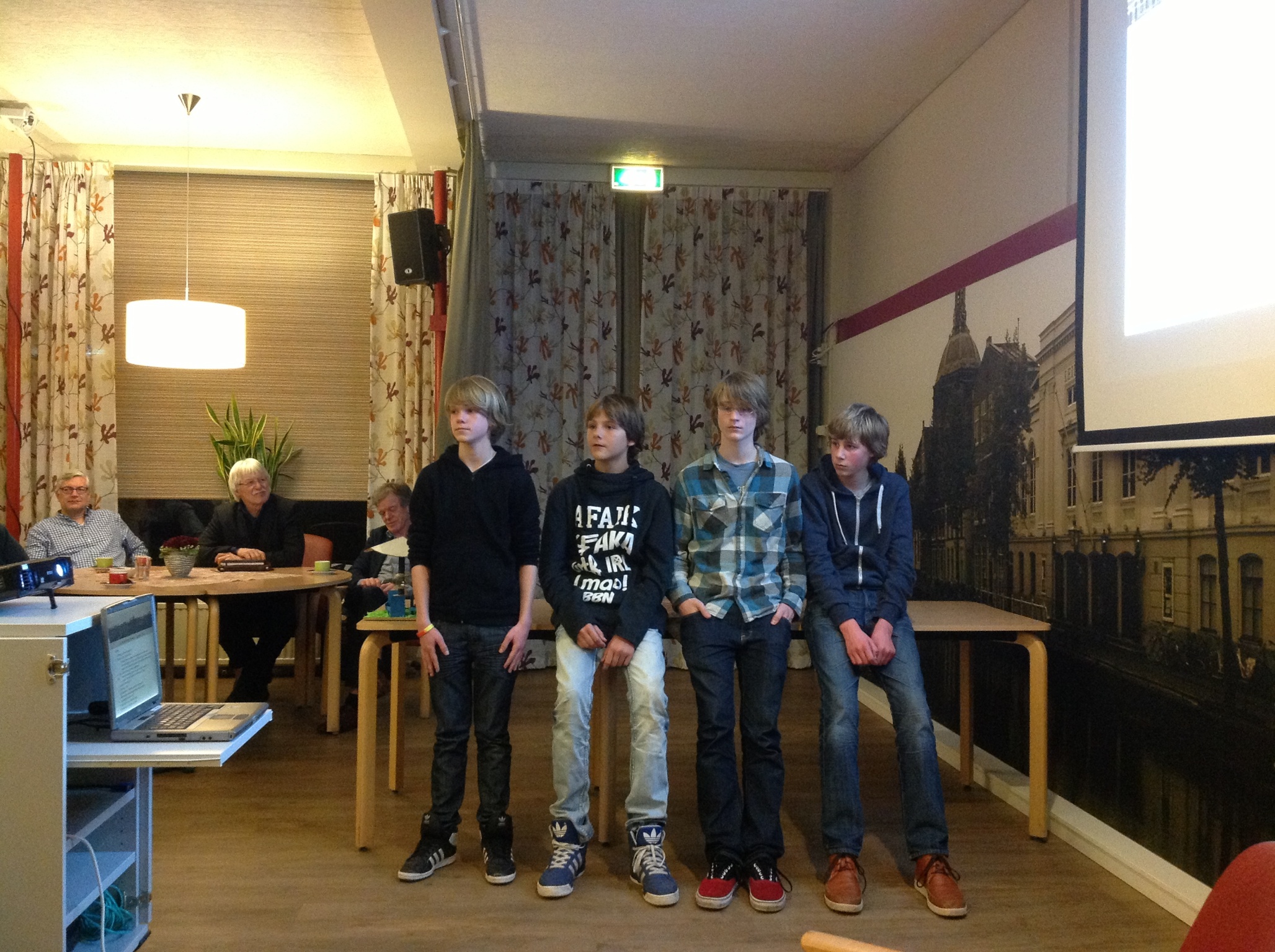 Hieronder: (links) de ontwerpers Max, Koen, Yvo en Teun en (rechts) spreekt Jo Jacobs mede-initiatiefneemster Liny Bijl toe.