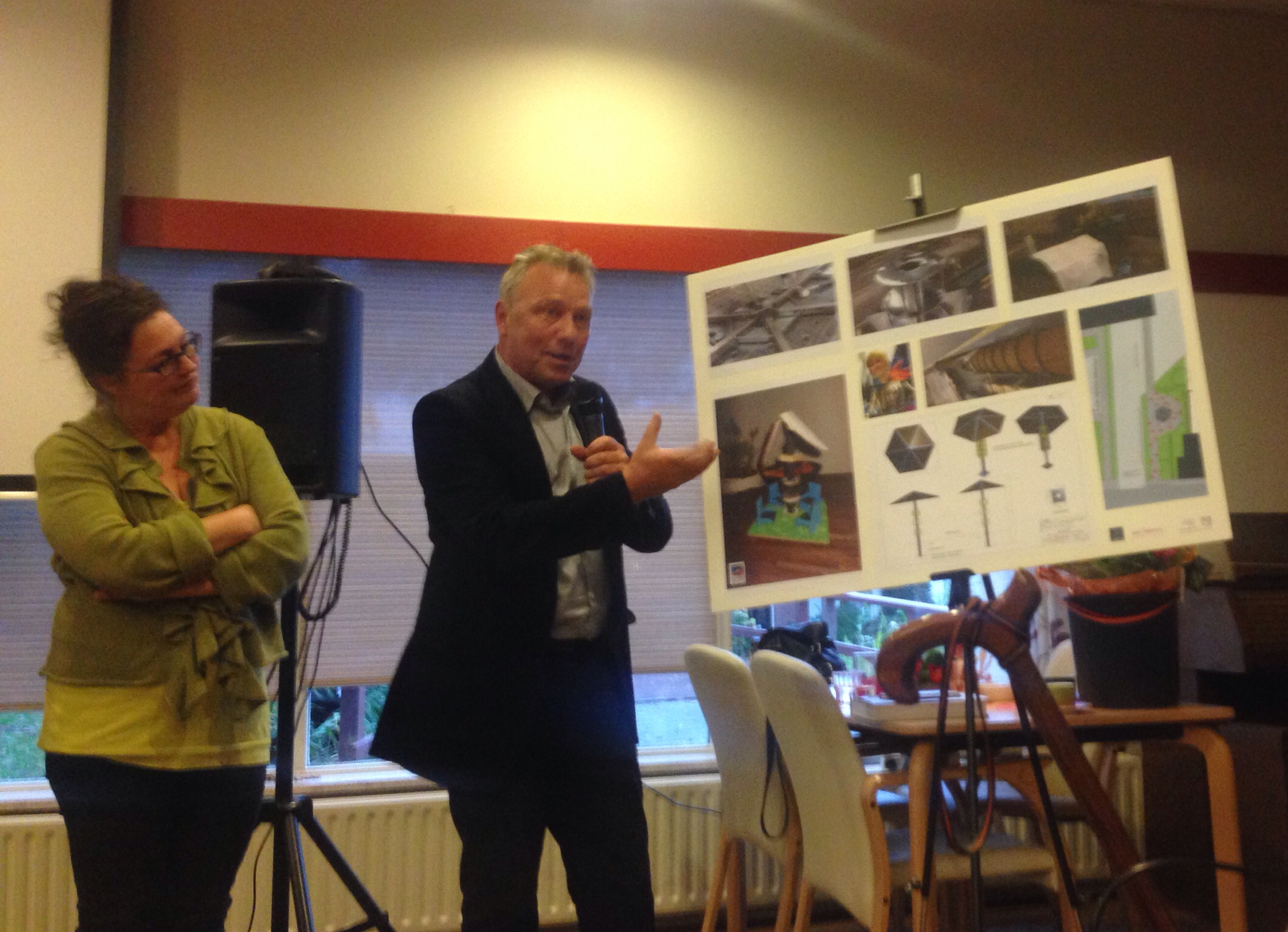 Op de foto’s hieronder; (links) de stuwende kracht achter het regelwerk rondom de boekenboom: Martine Brandt. Architect Ben Schildwacht (rechts) licht de ontwerpen en de samenwerking met Kasteel Metaal BV uit Zoeterwoude-Rijndijk toe aan wethouder Van Gelderen en de vele aanwezigen.