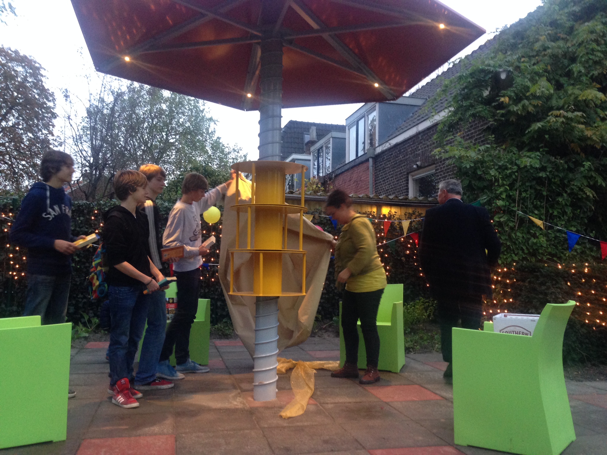 Wethouder Van Gelderen en de ontwerpers van de boekenboom nemen de boekenboom in gebruik.