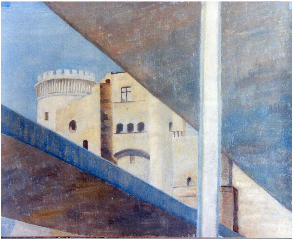 Een realist dus, maar soms gaat een schilderij met hem op de loop. Dan krijgt het illusionistische of surrealistische trekken. Koenraad: “In plaats van een modern gerenoveerde kasteelmuur met rechte kantoorramen verschijnen bijvoorbeeld de oorspronkelijke middeleeuwse vensters, hangend in de blauwe hemel die er nog veel eerder dan het hele kasteel was. Of mensen op een trap ontstijgen geleidelijk een door zeedieren bevolkt milieu, op weg naar een wit stadje op een heuvel.”