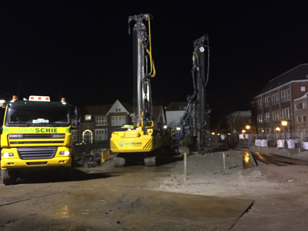 De twee machines die de damwanden plaatsen ten behoeve van de parkeergarage.