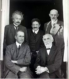 Einstein, Ehrenfest, De Sitter, Eddington en Lorentz in de werkkamer van De Sitter in Leiden (1923)