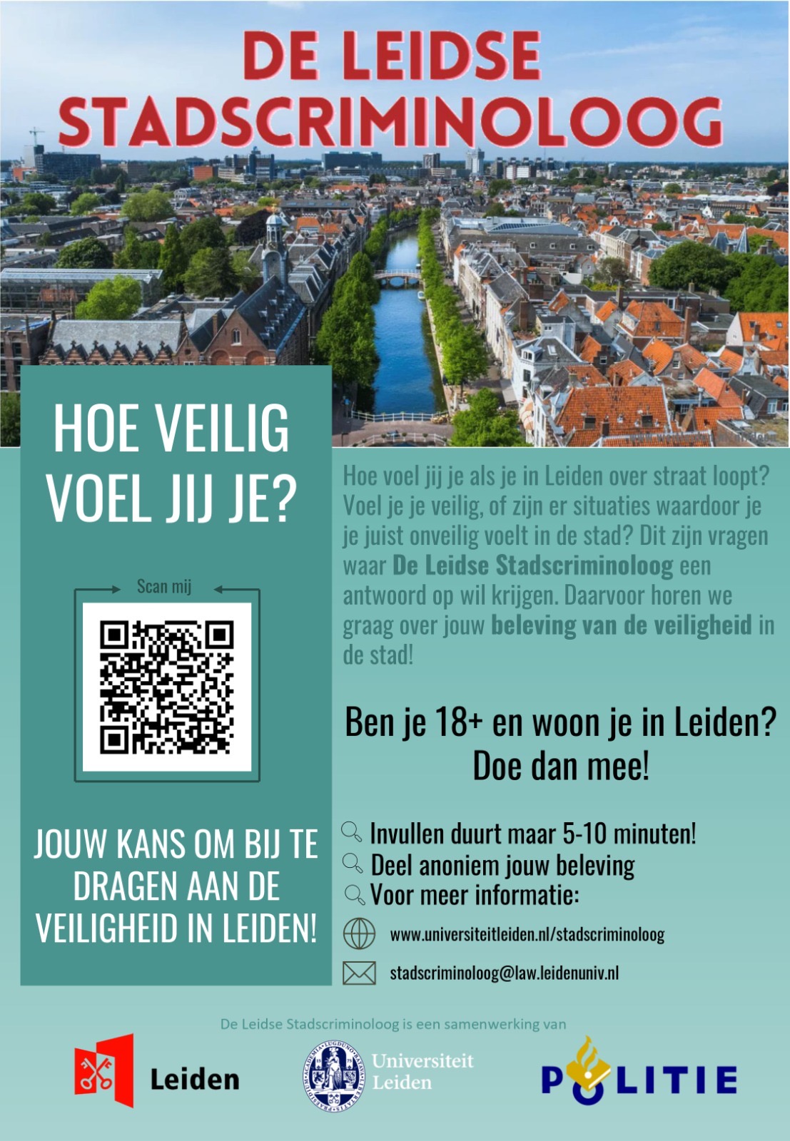 De Leidse Stadscriminoloog is een samenwerking van de Universiteit Leiden, gemeente Leiden en politie. De Stadscriminoloog probeert inzicht te krijgen in de veiligheidsbeleving van de inwoners van Leiden. Waardoor voelen mensen zich (on)veilig en hoe zou dit verbeterd kunnen worden? Hiervoor horen we graag wat jouw belevingen op dit vlak zijn! Leidenaren (18+) kunnen in slechts 5 – 10 minuten hun ervaring delen via de vragenlijst in de onderstaande link: https://leidenuniv.eu.qualtrics.com/jfe/form/SV_8IYbozImjVfgSmq