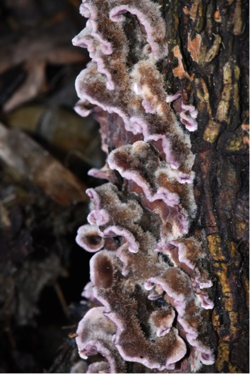 De paarse eikenschorszwam (Peniophora quercina) komt vooral veel voor op dode, nog aan de boom zittende eikentakken, in bossen en parken. Meerdere exemplaren groeien aaneen tot een korstige laag. Bij opdrogen of verouderen wordt de kleur rossig of lila-grijs. In verse toestand is de paarse eikenschorszwam donkerpaars met rode tonen. In dit stadium op de foto worden er sporen ontwikkeld en verspreid. Ik had een paar kleine stukjes eikentak die op de grond lagen, meegenomen, nieuwsgierig naar wat de pimpelmezen nu precies vinden aan larven om te eten. Ik vond tussen de korstmossen niets. Maar op paarse eikenschorszwam vond ik wel deze mijten. De mijten zijn heel klein +/- 0,025 mm. Ze grazen in groepjes de paarse eikenschorszwam af maar dat lijkt weinig schade aan de paarse eikenschorszwam te geven. Het lukt mij niet om de mijten te determineren. Er zijn zo’n +/- 45.000 mijten beschreven en waarschijnlijk nog veel onbeschreven. Wel duidelijk is dat deze mijt voorkeur heeft voor de paarse eikenschorszwam. Als iemand de mijt wel herkent, hoor ik het graag.