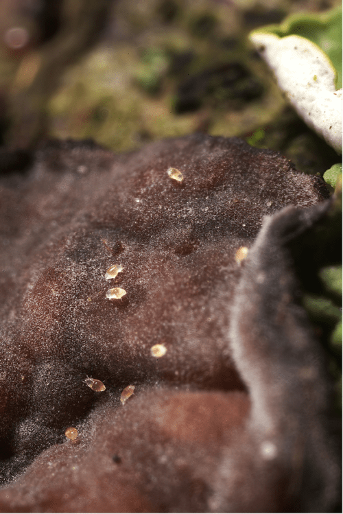 Mijten die specifiek leven op de paarse eikenschorszwam