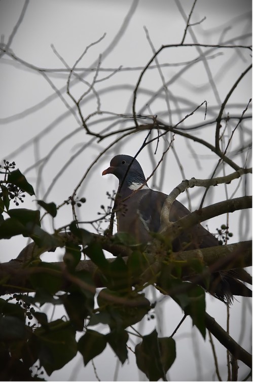 De houtduif (Columba palumbus) is de grootste en ook de meest voorkomende duif van Nederland. Je ziet de houtduif vaak in steden, o.a. in tuinen en parken. In de Ruigte broedt een koppel houtduiven elk jaar bij de Oude Sloot. Meerdere bomen in De Ruigte zijn begroeid met klimop. Zolang de klimop zich beperkt tot de stam van de boom, heeft de boom er weinig last van. Ik heb al eerder verteld hoe belangrijk de klimop is voor insecten vanwege zijn late bloei. Als nestlocatie is de klimop gewild bij vele vogels, maar vooral bij de houtduiven. Rijpe bessen van de klimop zijn gewild onder merels en deze houtduiven. De houtduiven in De Ruigte waren vroeg begonnen met het nestbouwen. De eerste eieren eind januari. Er is wat verstoring geweest door zaagwerkzaamheden. Helaas vond ik een leeg ei 1 febr. op de grond. Jammer, maar ze zijn alweer bezig met een nieuw nest bouwen.