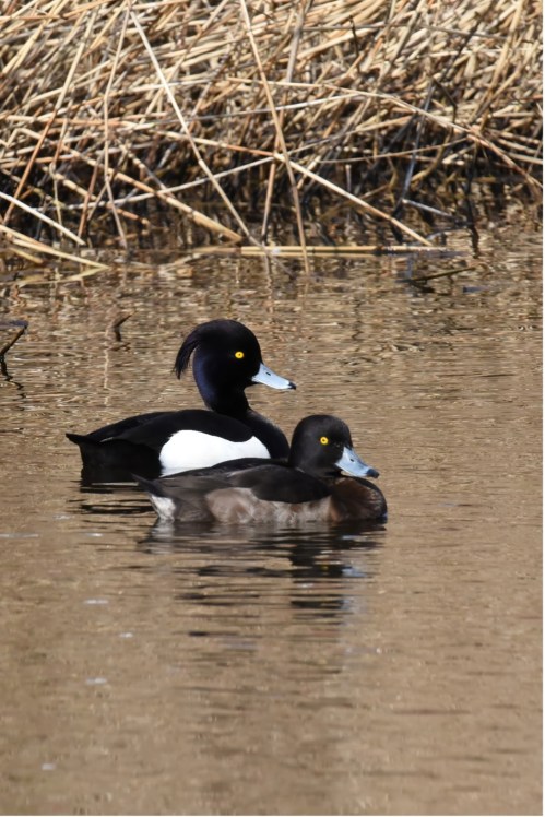 Erg leuk om te zien dat de kuifeend (Aythya fuligula) als koppel terug is, het tweede jaar achtereen. In grote delen van Europa is de kuifeend een standvogel. Maar meer noordelijk trekt de kuifeend naar het zuiden in de winter. Vandaar dat er in de winter in Nederland meer kuifeenden zijn dan in de zomer. Ze eten waterinsecten, slakken en planten, maar het liefst eten ze driehoekmosselen. Met hun korte sterke snavel zijn ze goed in staat om deze mosselen los te maken. Het zijn hele goede duikers. De achterpoten staan verder naar achteren dan bij andere eenden. Als ze lopen doen ze dat wat rechterop zoals de aalscholver of, wat extremer, de Indische loopeend die in De Ruigte zwemt. Vorig jaar had ik de indruk dat ze gebroed hadden, maar zonder resultaat. Misschien dit jaar.