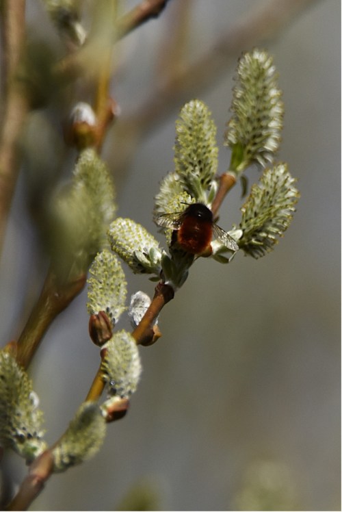 De bloemen van de grauwe wilg (Salix cinerea) zijn geliefd bij zowel hommels als de Metselbij. De grauwe wilg groeit meestal als een struik en kan tot zes meter hoog worden, wat ze bijzonder waardevol maakt voor insecten. Rupsen van onder andere de grote weerschijnvlinder, bruine grijsbandspanner en klaverblaadje leven op deze wilg. Bovendien behoort de wilg tot de vroegbloeiers, waardoor zij een van de eerste leveranciers is met een rijke hoeveelheid aan stuifmeel en nectar. In deze maand, wanneer het mooi weer is, kun je in De Ruigte hommels en bijen zien zoeken naar rijpe bloemen in de toppen van de grauwe wilg, zoals deze gehoornde metselbij.