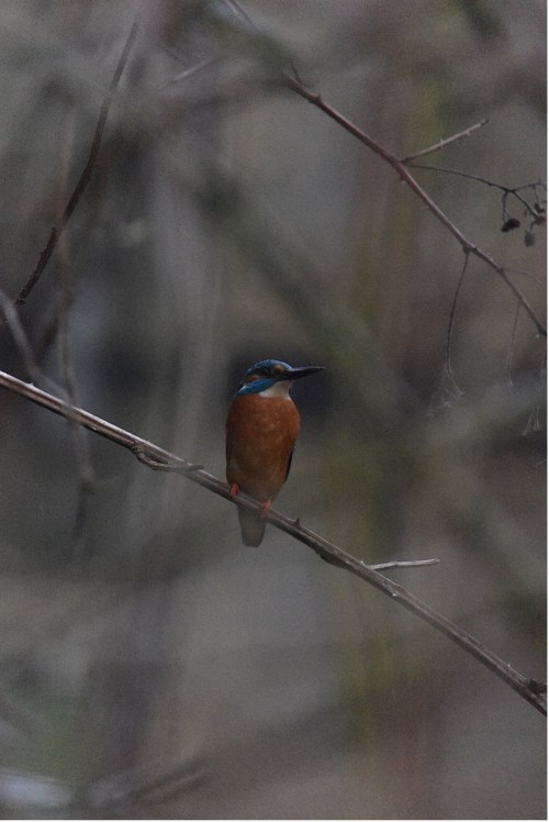 Terug op de zuidzijde van de “berg” constateerde ik dit jaar tot mijn genoegen dat de ijsvogels (Alcedo atthis) actief waren bij de ijsvogelwal met het bouwen van nesten. Twee koppels waren al vergevorderd in het nestproces, terwijl een derde koppel nog op zoek was naar een geschikte locatie. Vanaf de vogelkijkwal bood zich een uitstekend uitzicht op deze activiteiten. Op deze bijzonder mistige ochtend werd het vrouwtje ijsvogel net afgelost door het mannetje, zodat zij haar vleugels kon strekken en voedsel kon zoeken. De ijsvogel is goed te herkennen aan het opvallende contrast tussen zijn blauwe bovendelen en oranje onderdelen, maar staat ook bekend als een schuwe soort die zich zelden laat zien. Binnen Europa is dit de enige ijsvogelsoort die zo noordelijk voorkomt, waaronder in Nederland en België.