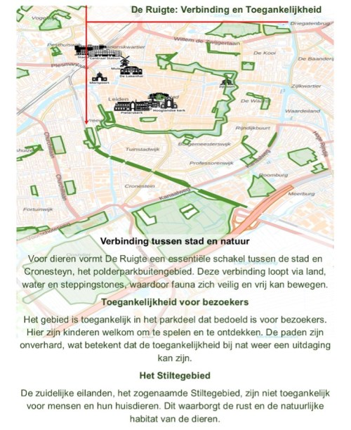 Een van de informatiedocumenten gaat over de verbinding tussen De Ruigte en het buitengebied. Het spoor naar Cronesteyn is aan beide zijden afgezet met groene spoordijken. Ondanks de bruggen en het station Lammenschans is er een groene strook van minstens 15 tot 20 meter breed, waardoor dit een sterke ecologische verbinding biedt naar het centrum van Leiden, zelfs lopend voor landdieren.