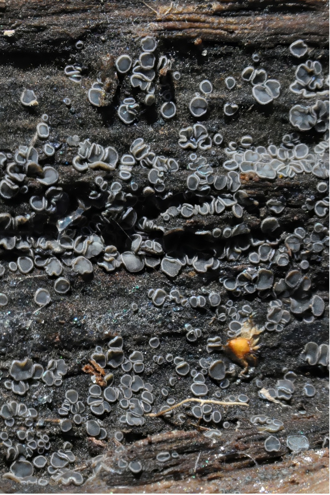 Wanneer een boomstam wordt verplaatst, kan een vochtig microklimaat aan het oppervlak zichtbaar worden. Aan de onderzijde van dergelijke vermolmde stammen ontwikkelt zich de Gedrongen Mollisia (Mollisia cinerea), een schimmel die op het hout van diverse loofboomsoorten, waaronder beuk, berk, eik, hazelaar en linde, voorkomt. In uitzonderlijke gevallen wordt deze soort ook aangetroffen op naaldbomen. De Gedrongen Mollisia draagt bij aan de geleidelijke afbraak van hout. Deze schimmel wordt voornamelijk waargenomen in vochtige, natte bossen op voedselrijke en basische bodems, maar kan ook voorkomen op de onderzijde van boomstronken in grasrijke gebieden zoals De Ruigte. Het betreft een beker- tot schotelvormige zakjeszwam die vaak in grote groepen verschijnt, soms bestaande uit honderden exemplaren.