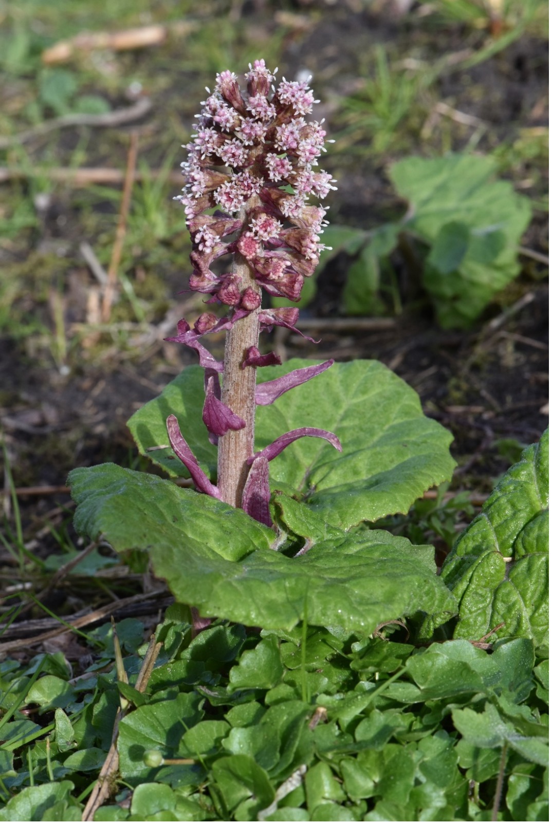 Wanneer je aan de noordzijde naar beneden loopt, zie je in de kom hoe het groothoefblad (Petasites hybridus) zich boven het oppervlak ontplooit. De bloemen zijn prachtig. Je kunt de bladeren dagelijks zien groeien; ze ontwikkelen zich tot rabarberachtige proporties met geribde stelen van soms wel een meter lang en enorme bladoppervlakken tot een halve meter breed. Over enkele weken is het gebied rond de wilgenhut weer volledig bedekt met groothoefblad.