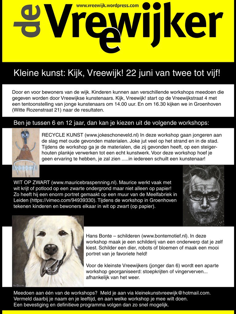 Inmiddels vorderen de aanmeldingen voor de workshops voor de kleine kunst in Vreewijk op zondagmiddag 22 juni. Het wordt een hele leuke middag!
