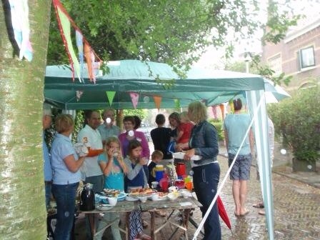 Een partytent met tafels eronder voor de meegebrachte lekkernijen. Thee, koffie, (zelfgebrouwen!) vlierbloesemlimonade. Vijfentwintig straatbewoners.