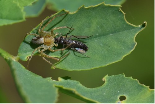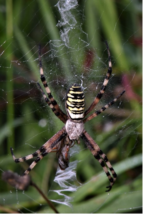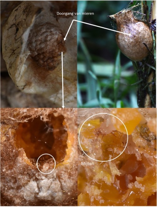 In de foto van de cocon in oktober bleken de mieren te veel geconsumeerd te hebben. Er zijn slechts twee spinnen verveld die nu twee weken oud zijn en rond 1,5 mm groot. Hun chitinepantser is nu nog niet hard. Hierdoor kunnen ze nog iets groeien. Als je de literatuur erop naslaat kan een wespspin (Argiope bruennichi) +/- 200 nakomelingen krijgen. De cocons van vorig jaar hadden +/- 50, aanzienlijk minder. Bij een andere cocon was ook schade van mieren, maar daar waren de mieren niet in de eicocon gekomen.