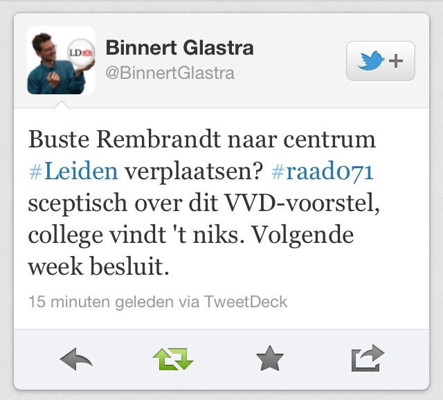 Zoals u wellicht bekend zal op 19 april as in de gemeenteraad een voorstel van Juliette Gilissen [VVD] worden besproken om de buste van Rembrandt te verplaatsen van de Witte Singel naar een plek binnen de singels.