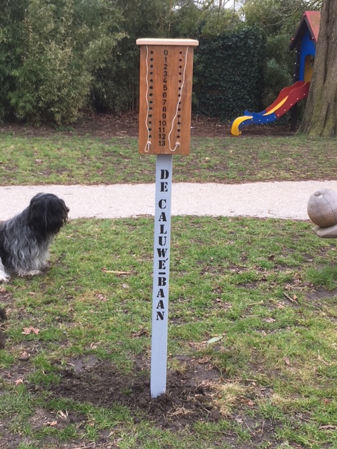 Het scorebord van de jeu de boulesbaan met de naam van Twan de Caluwé erop, dat eerder deze winter was gesneuveld als gevolg van vandalisme, is door Cees Guijt van de Rijn en Schiekade weer prachtig hersteld.